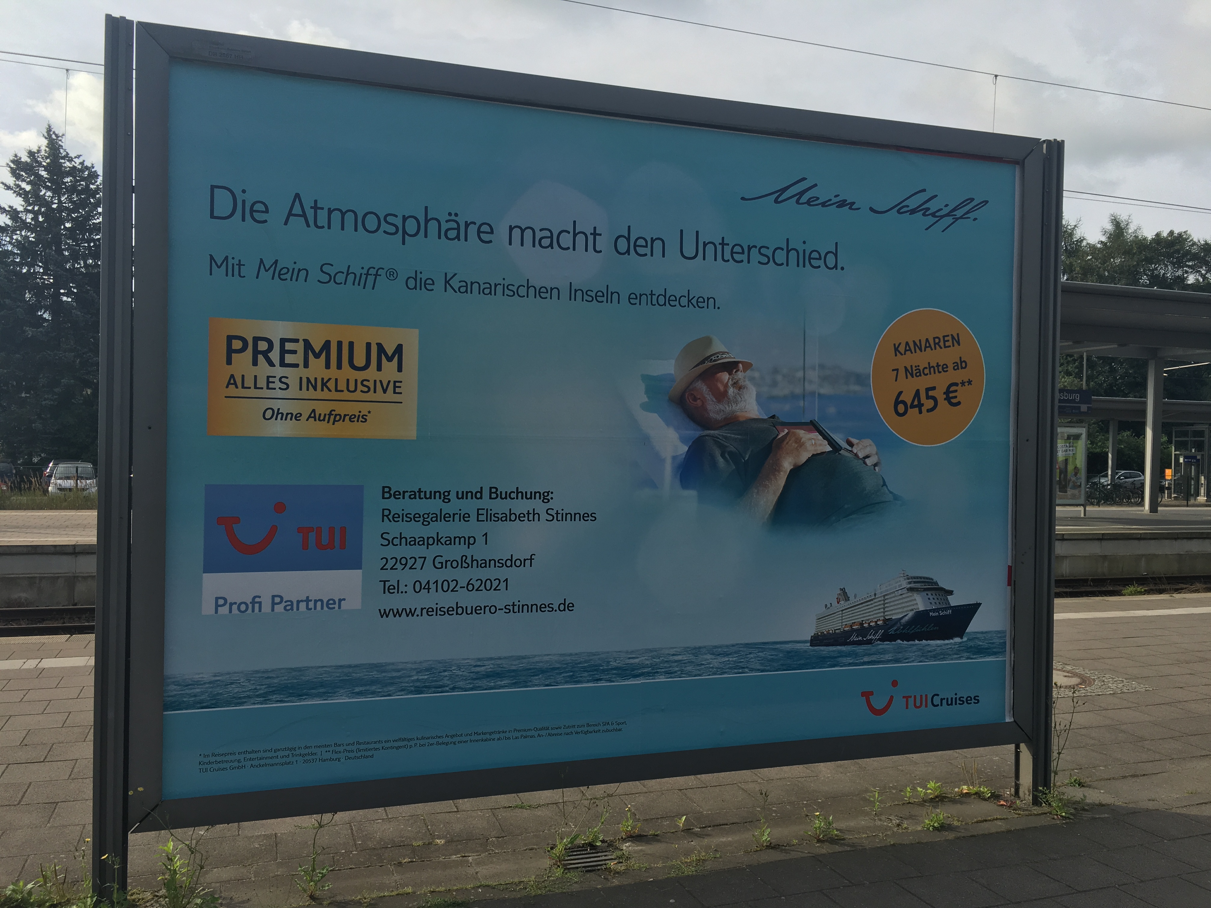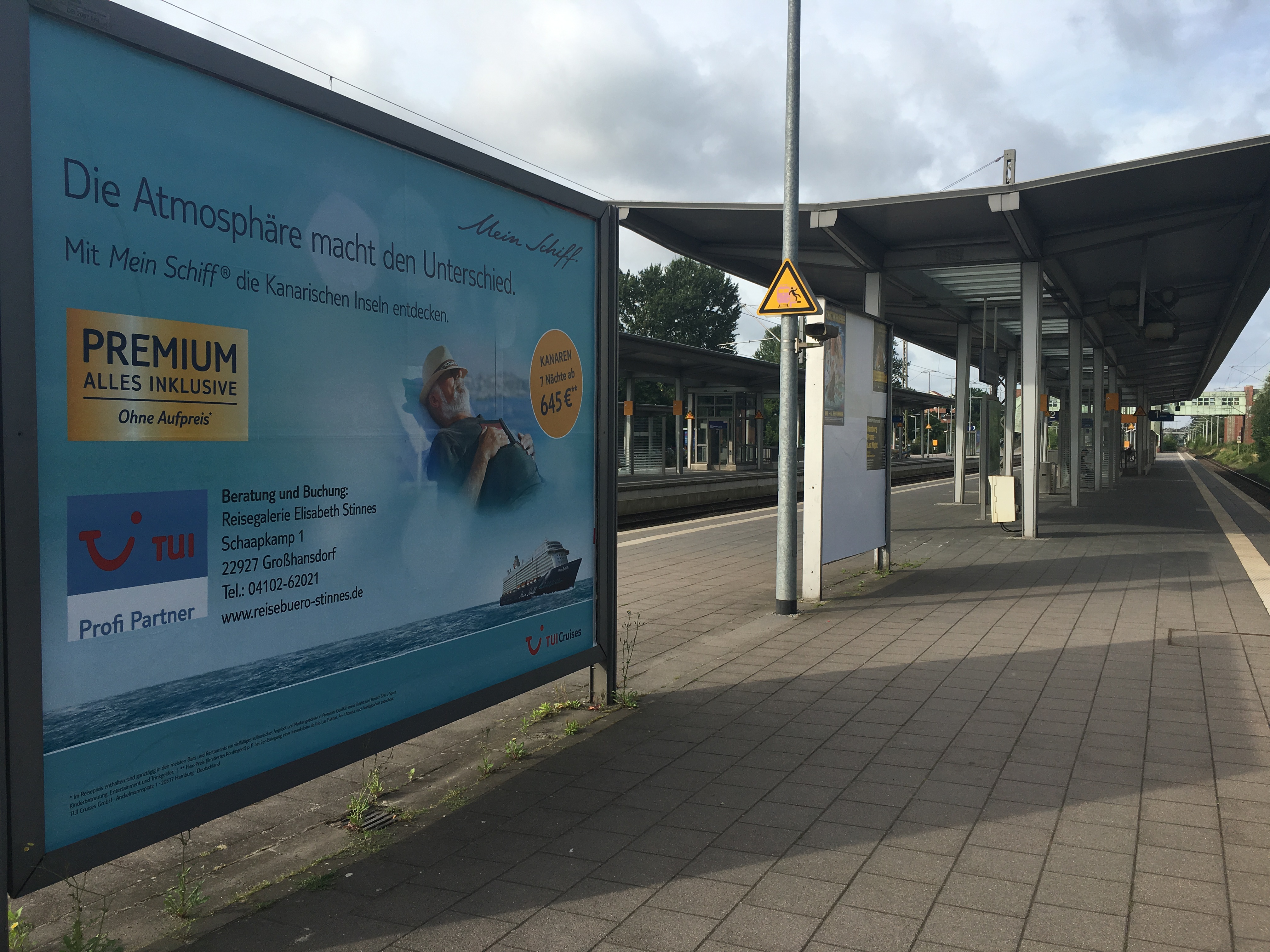 mit einem Plakat am S-Bahnhof Ahrensburg.