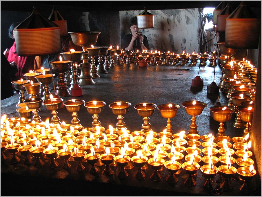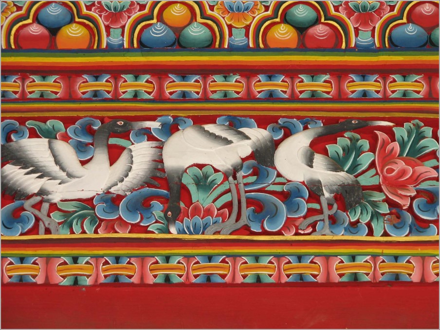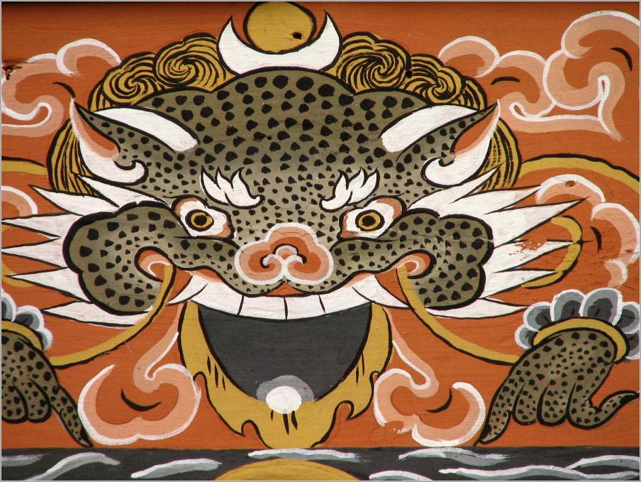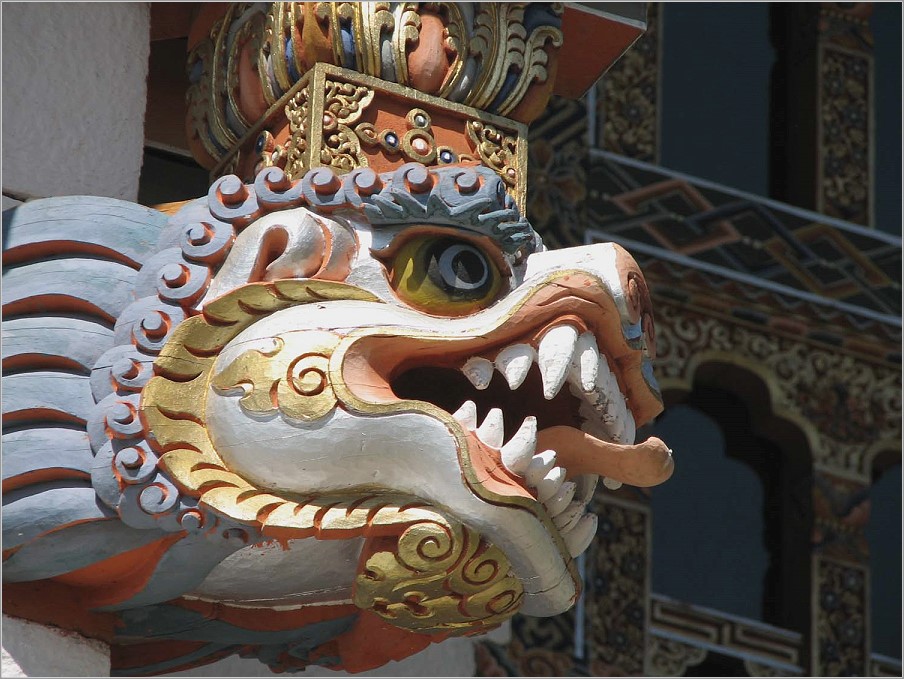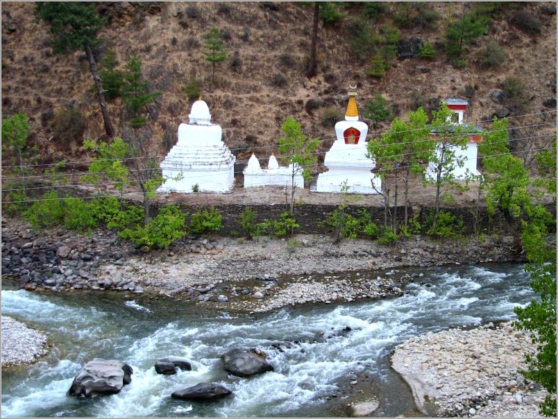 Überhaupt spielt der Glaube der Bevölkerung, der Buddhismus, eine überragende Rolle. Wir sahen etliche Klosterburgen, Dzongs, mit lebendigem Klosterleben, Gebetsfahnen, große und kleine Chörten (Stupas, die an den Besuch von Heiligen erinnern oder böse Geister fernhalten sollen), Wassergebetsmühlen... Die Fenster der Dzongs waren wie die Fenster der Wohnhäuser mit kräftigen Farben bemalt. Sie heben sich so von den weißen Hauswänden ab, die ihrerseits noch mit Symbolen bemalt sind.