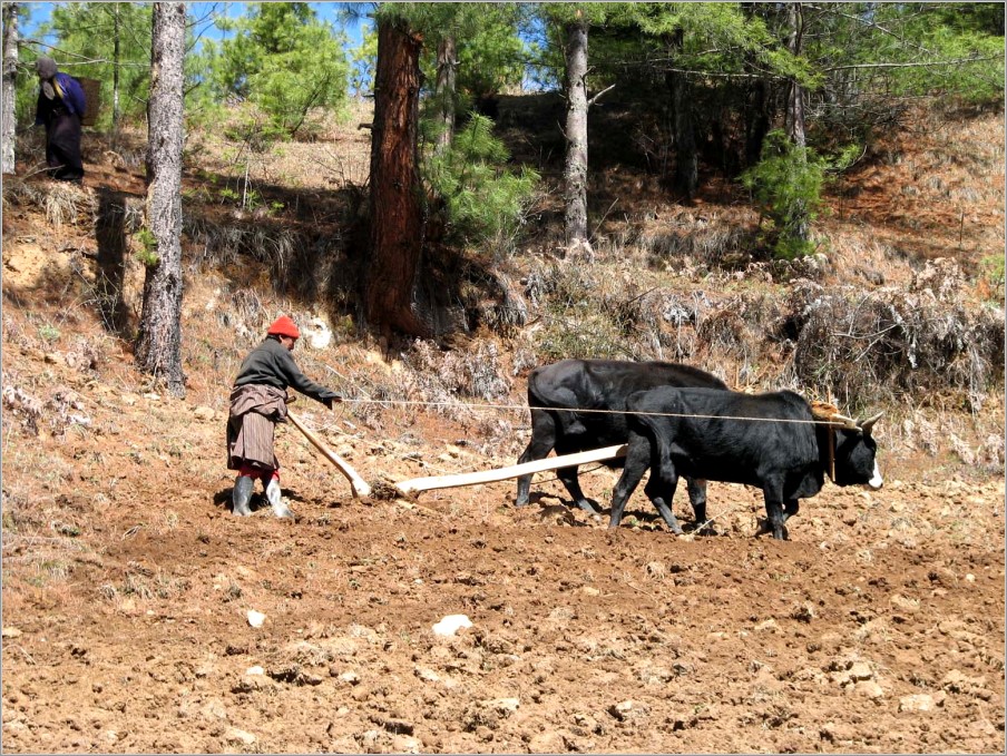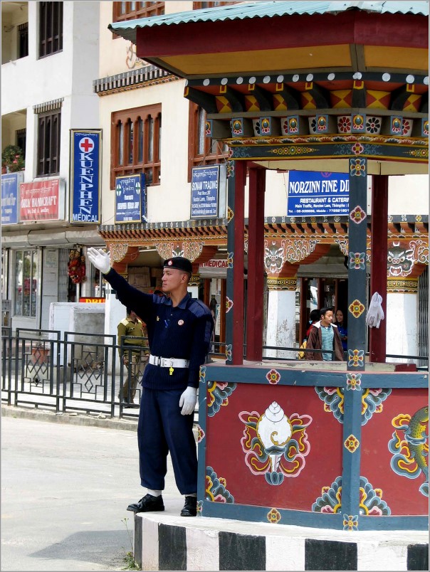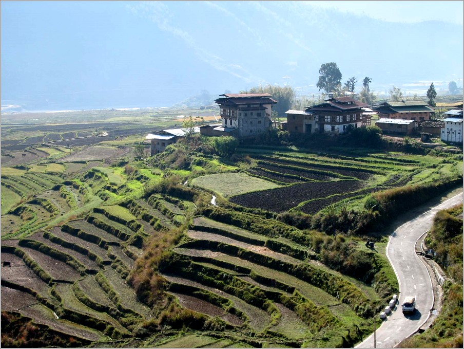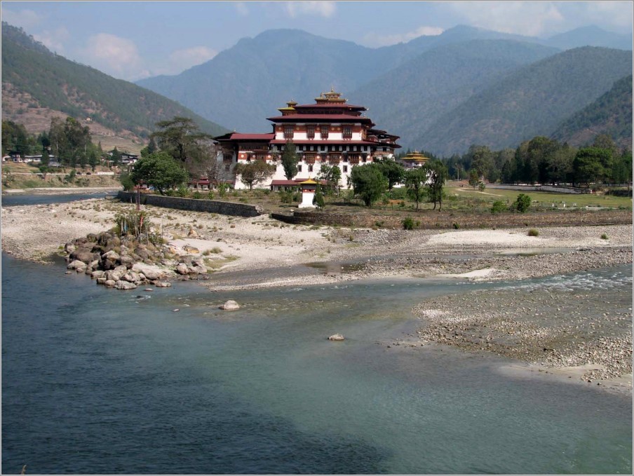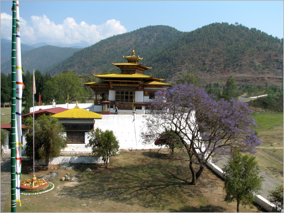 Über Frankfurt - Delhi flogen wir nach Bagdogra im NO Indiens, um dann per Bus einzureisen. Auf der 175 km langen Fahrt nach Bhutan bekamen wir auch von Bengalen einige Eindrücke: Dschungel, Reisfelder, Teeplantagen, Jak-, Tulpen-, und Teakholzbäume sowie Arekapalmen, heilige Kühe, Slums, an Flüssen Sandabbau und Große Wäsche,... Erst nach achtstündiger Fahrt erreichten wir das bunte Grenztor zu Bhutan. Hier ließen wir Lärm, Schmutz, Gestank und das Gewimmel hinter uns, denn wir waren in Bhutan angekommen mit seiner klaren Luft (Rauchen verboten!), den frohen Farben der Häuser und der Tracht, die alle Bhutaner tragen müssen, den vielfältigen Landschaftszonen.