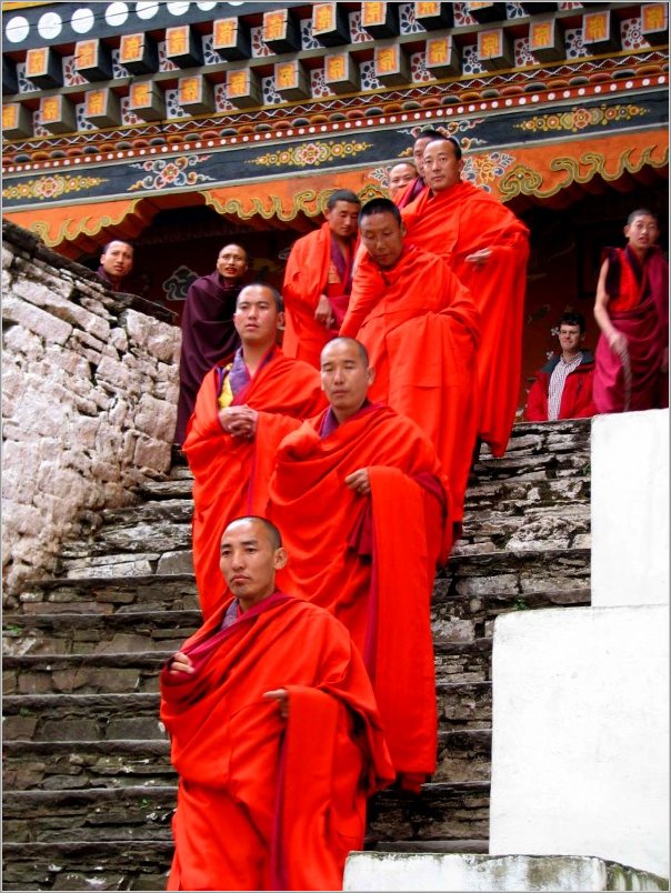 Die absoluten Höhepunkte der Reise waren natürlich das Tigernest, ein in 800 m Höhe am Felsen klebendes Kloster, dessen Bild in keinem Buch und keinem Kalender von Bhutan fehlt, und das fünftägige Klosterfest in Paro. Zu diesem Fest strömten festlich gekleidete Bhutaner aus nah und fern, um in Gesellchaft von Freunden das riesige Thangka-Bild und die Maskentänze zu sehen. Ablauf, Bewegungn, Maskierungen sind traditionell festgelegt. Zum Klang der Hörner, Trompeten, Trommeln, Becken wird getanzt. Die Schwarzhutzauberer "reinigen" auf diese Weise den Tanzplatz, Mönche vernichten im Mandalatanz das Böse, selbst die Helfer des Totengottes hüpfen, tanzen und wirbeln trotz ihrer schweren Tiermasken aus Holz herum... Dabei versucht nach alter Sitte eine Art Clown mit riesigem roten Holzpenis, die Akteure abzulenken, zu stören und die Zuschauer zum Lachen zu bringen. Am letzten Tag des Festes wurde in einer feierlichen Zeremonie das Thangka wieder aufgerollt. Die Menschen jubelten laut oder waren still ergriffen, einige beteten.